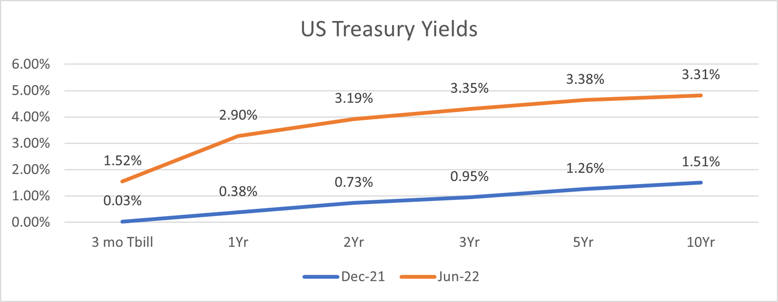 With that, the Treasury curve moved significantly higher to reflect this new expectation. On June 22, 2022, the 2-year yield was at 3.19%, and the 10-year yield was at 3.30%. The 2-year Treasury yield increased 246 basis points since year end and has not been this high since December 2007.