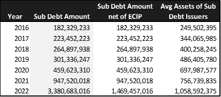 Even after adjusting for ECIP distributions, direct subordinated debt issuances increased from $950 million at the close of 2021 to $1.5 billion at the end of 2022, representing a 50% increase during the year. Upon further examination, the total amount outstanding at the end of 2016 was only $182 million. That means since 2016, total direct issuances (excluding ECIP) have increased by $1.3 billion, or 706%.